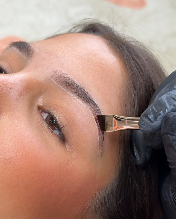 For an overall skin and hair stain, start with a thin layer of product on your brush and coat both the hair and press into the skin for an even and intense skin stain. We reccomend starting from the tail end of the brow.